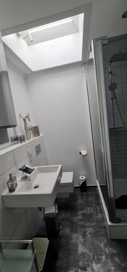 Das elegante Bad ist mit hochwertigen Armaturen und einer geräumigen Dusche ausgestattet. Klare Linien und helle Fliesen schaffen eine entspannende Wohlfühl-Oase, die durch ein Oberlicht mit natürlichem Tageslicht erhellt wird.